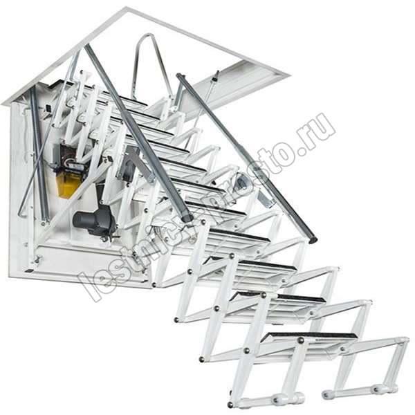 Автоматическая раздвижная ножничная чердачная лестница, с электромотором для дистанционного открывания.