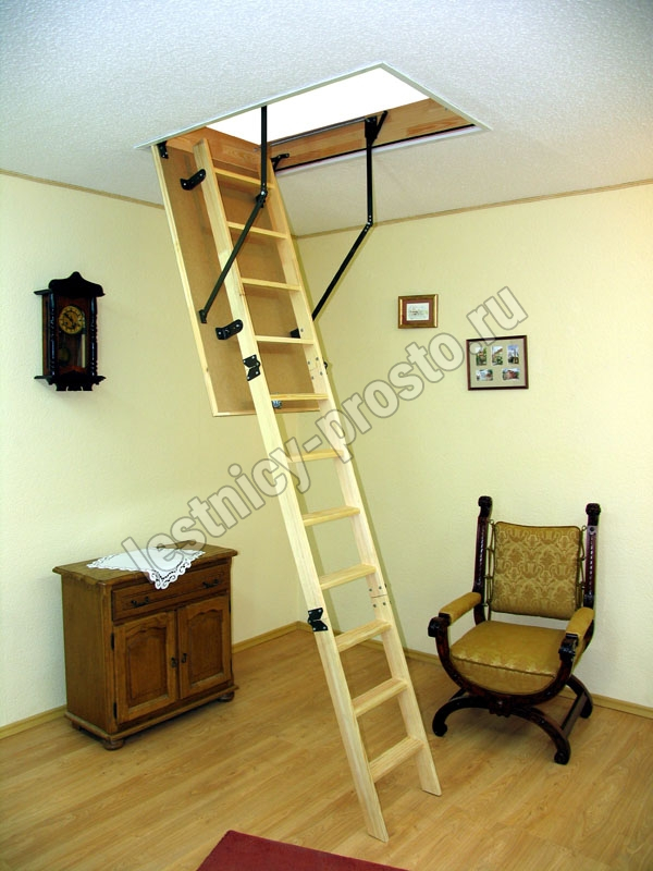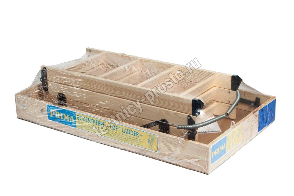 Термоизоляционная крышка типа "сэндвич", толщиной 30 мм, облицована с двух сторон ДCП древесного цвета. Короб люка с уплотнителем. Все металлические элементы лестницы покрашены порошковой краской, ступени лестницы имеют антискользящие насечки и закреплены в столярное соединение «ласточкин хвост», что позволяет выдерживать нагрузку 150 кг. Деревянный стержень для открывания лестницы в комплекте. Две последние секции разобраны. С помощью дополнительной секции высоту лестницы можно увеличить на 55 см.