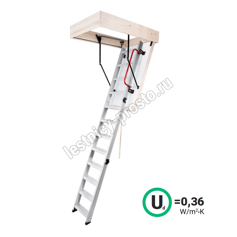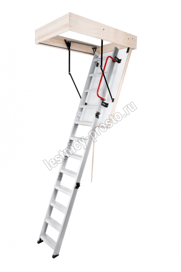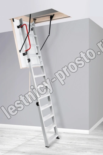 Складная 3-х секционная чердачная лестница. Рабочая поверхность полностью выполнена из алюминия. Термоизоляционная крышка типа "сэндвич" имеет усиленную теплозащиту, облицована с двух сторон ДВП белого цвета. По контуру короба имеется уплотнитель; Все металлические элементы лестницы покрыты порошковой краской.