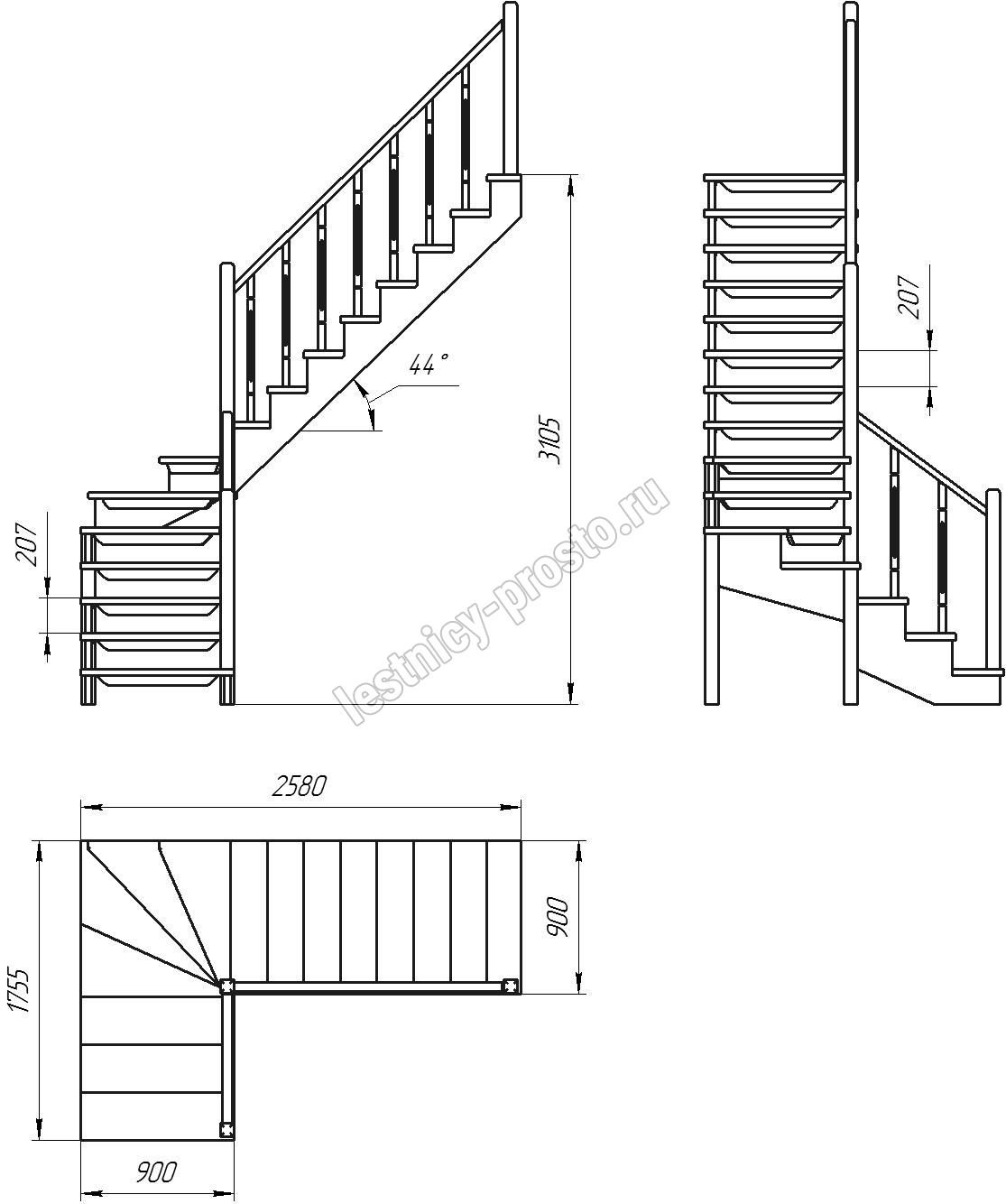 Деревянная межэтажная лестница ЛЕС-09 3105 проем 2580-900, Лиственница