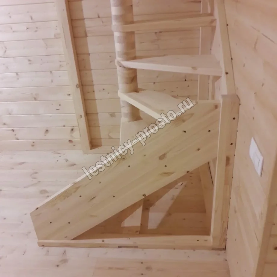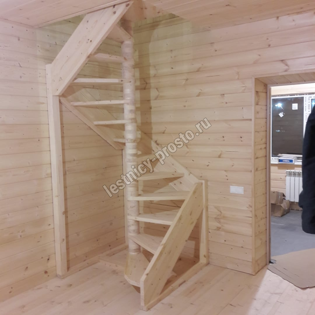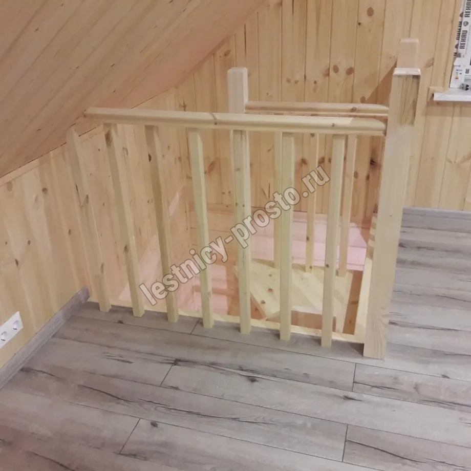 Небольшая аккуратная лестница, хорошо подойдет для помещения с небольшим проемом, поможет сэкономить пространство и организовать комфортный подъем на  уровень выше. Возможны варианты лестницы из сосны под покраску, сосны, дуба, бука или ясеня. Для увеличения срока эксплуатации мы рекомендуем покрыть элементы лестницы защитным средством. Вы можете сделать это самостоятельно или заказать предварительное покрытие необходимым средством (или тонирование) в нашем цеху.