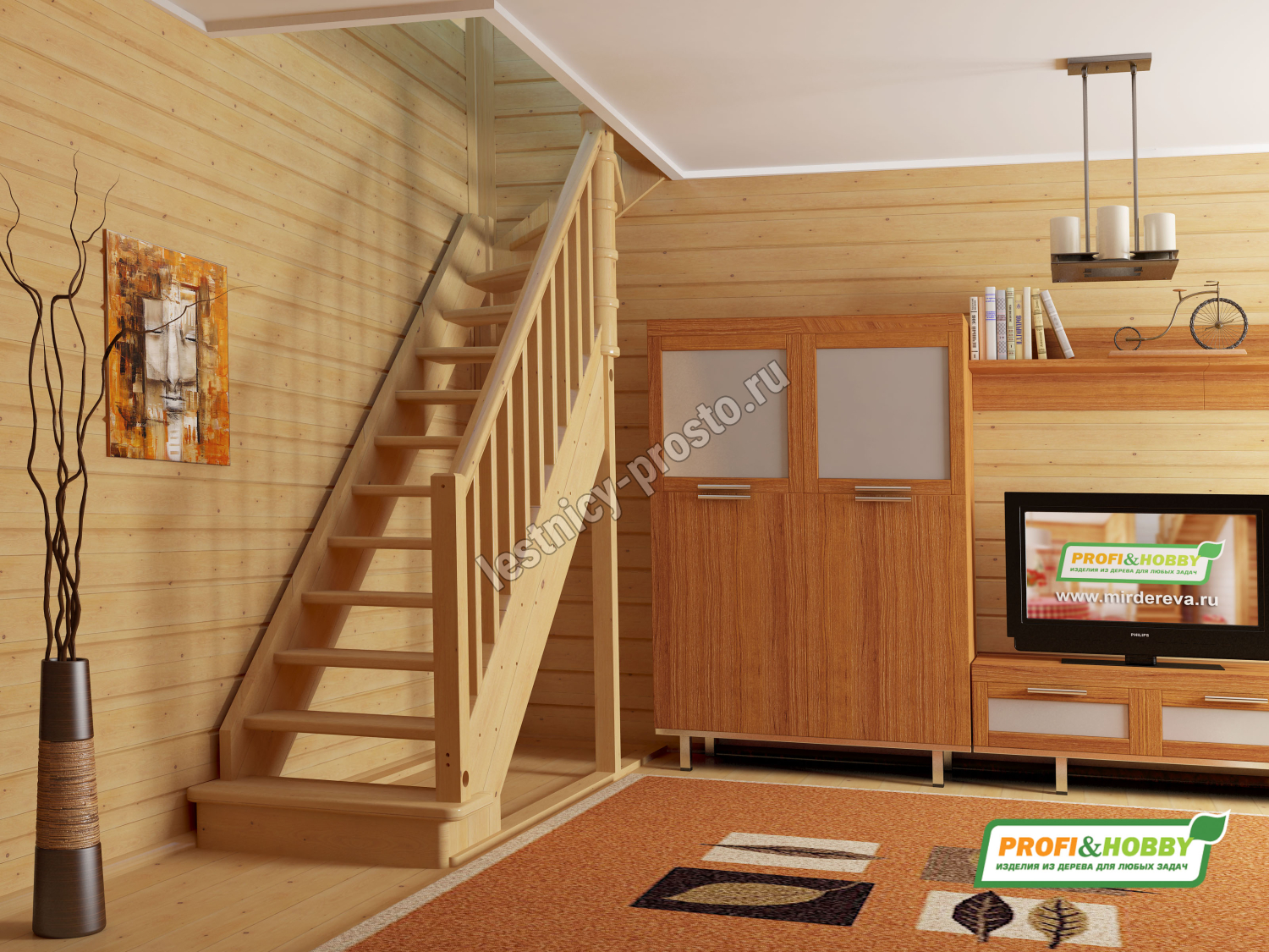 Ступени и поручень лестницы изготовлены из дуба, остальные элементы из сосны.