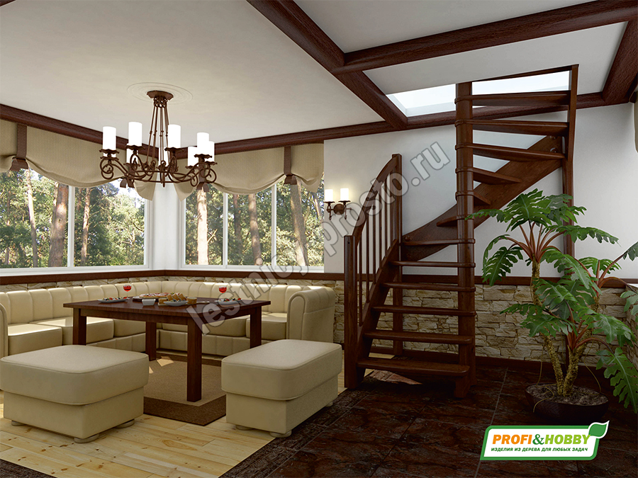 В производстве лестницы ЛС-04м под покраску используется сосна с небольшими изменениями цвета, что практически не влияет на ее механические свойства и почти незаметно при покраске в темные цвета. Базовый комплект включает в себя деревянные элементы лестницы и ограждения без какого-либо покрытия.