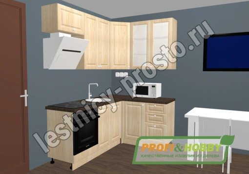 Угловой кухонный гарнитур из 100% массива сосны размером 2 на 1,4 и высотой 2,32 м (в данном проекте использованы высокие верхние ящики 90 см). Цвет на выбор - 27 вариантов (при заказе кухни в нашем интернет магазине просьба указывать название цвета в комментариях).