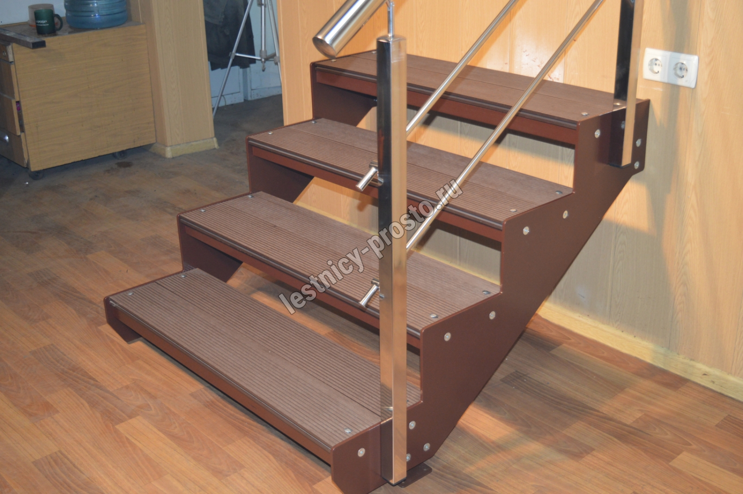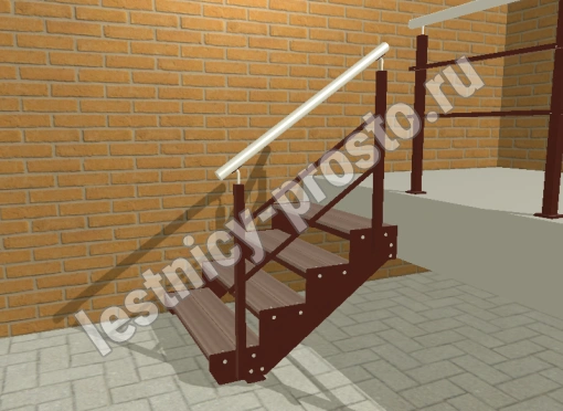 Ступени лестницы состоят из металлической рамки, обеспечивающей необходимую прочность, и покрытия из террасной доски ДПК (древесно-полимерный композит). Ступени не боятся воды и мороза, не теряют со временем свой внешний вид и не требуют ухода.