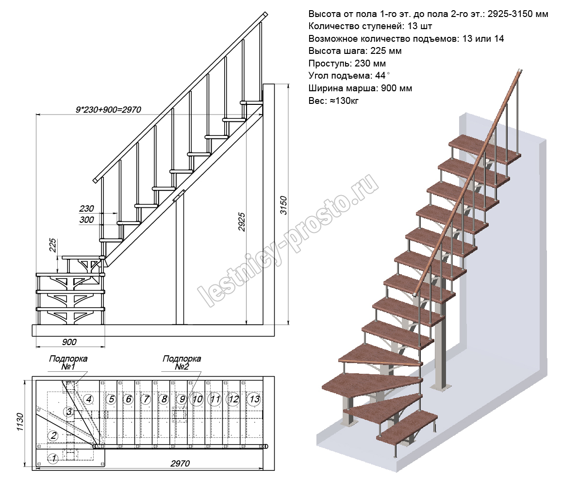 Высота лестницы 2925 - 3150 мм