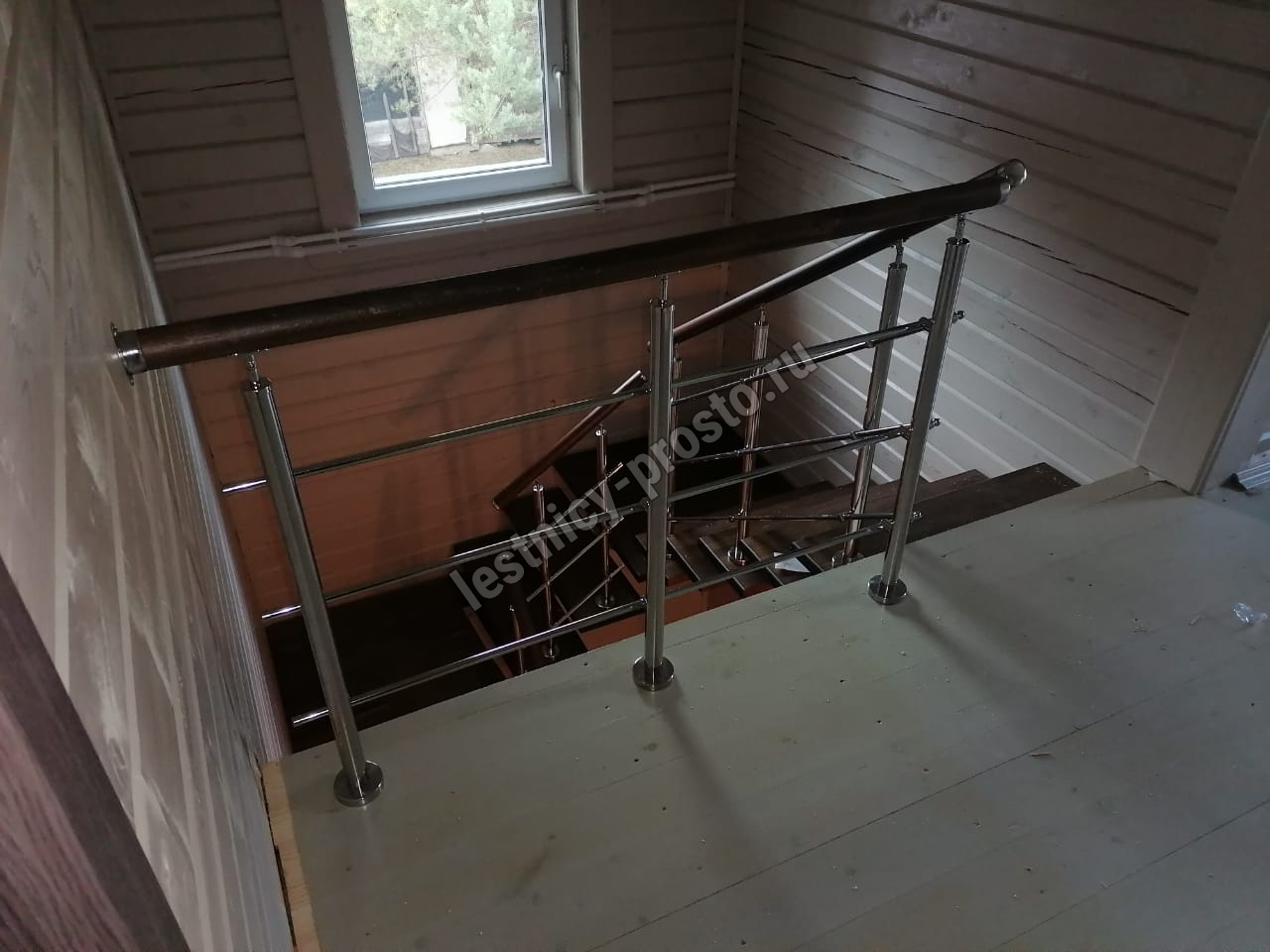 Ступени лестницы выполнены из лиственницы без какого-либо покрытия.