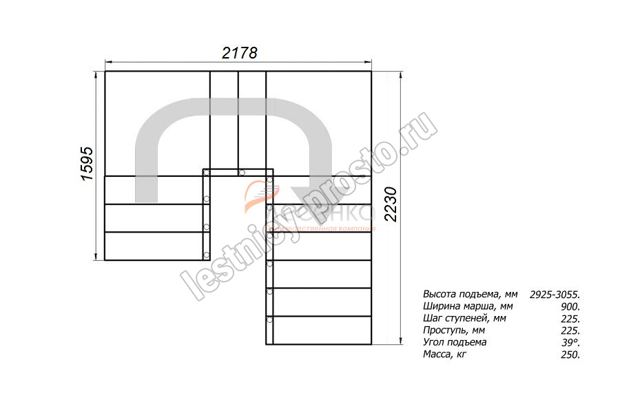 Модульная лестница Комфорт 225 2925-3055, Серый, Лиственница, Нержавеющая сталь