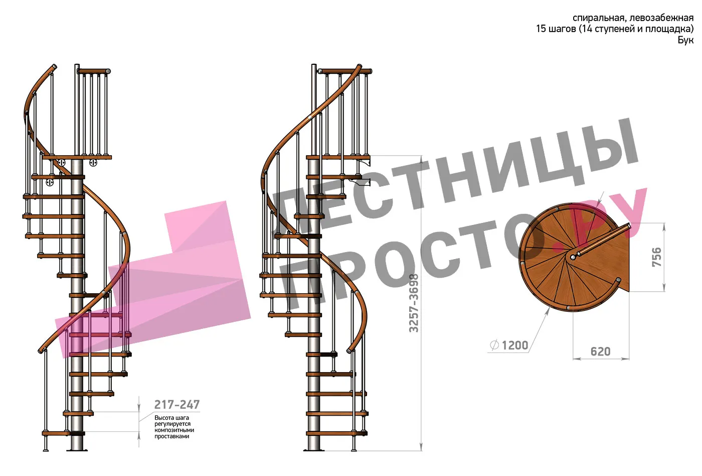 Решение о направлении поворота принимается при сборке лестницы - универсальная конструкция позволяет собрать правозабежную и левозабежную лестницы. Высота ступеней регулируется с шагом 3 мм. в пределах 217-247 мм., благодаря чему, лестница прекрасно подгоняется под необходимую высоту.