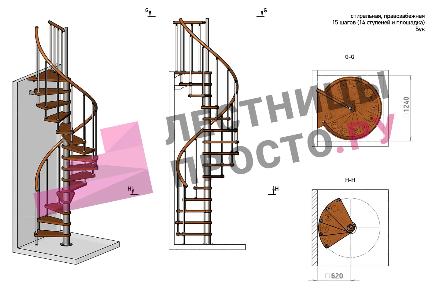 Ширина ступени между стойками и центральной колонной ≈ 48 см